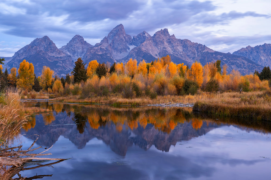 The Grand Tetons are reflected in a small stream of water before dawn at the height of fall foliage season. In this six-second photo, when the day stood perfectly still, I captured a sense of autumn all around. Shot in medium format and then cropped to a standard 3:2 aspect ratio, this image has incredible depth, detail, and the perfect smooth color seen before sunrise.